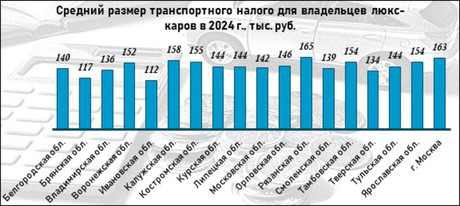 За год средние показатели по Центральному округу уменьшились 7% или 12 тыс. руб. В 2023 г. налог для собственника элитного автомобиля составлял 170 тыс. руб., тогда как в 2024 г. обязательный платеж за владение премиальным транспортом равен 158 тыс. руб.