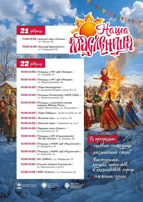«Программа традиционная и любимая многими: силовые состязания, масленичный столб, народные забавы, концертные номера и, конечно, сожжение чучела Масленицы», - написал мэр в своем телеграм-канале и пригласил липчан провести эти дне вместе, в теплой и дружелюбной атмосфере.