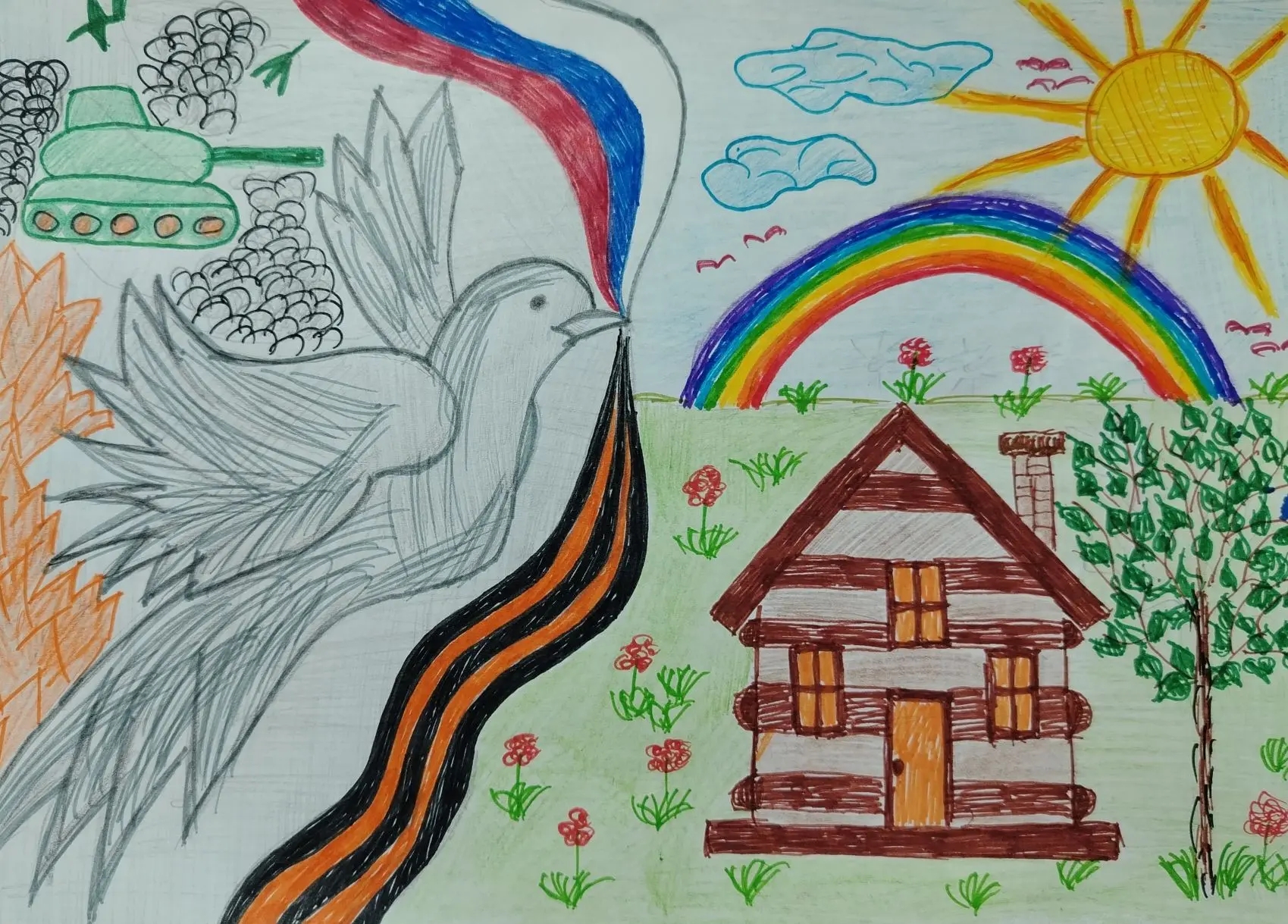 Описание: Этот рисунок ярко иллюстрирует контраст между войной и миром, подчёркивая ценность мирного неба над головой. Композиция разделена на две части, каждая из которых несёт свой смысл.