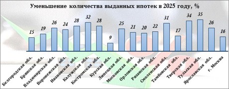 Относительно 2024 года серьезное сокращение заключенных договоров фиксируется практически во всех регионах. Под "серьезным сокращением" понимается двузначное уменьшение количества выданных ипотечных займов в 17 регионах округа. Только в Курской области уменьшение прекратило движение вниз до отметки в 10%.